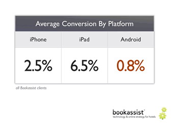 當(dāng)你看到以下數(shù)據(jù)時(shí),會(huì)覺得很有趣,Android用戶帶來的轉(zhuǎn)化率遠(yuǎn)低于平均水平,僅為0.8%;iPhone用戶帶來的轉(zhuǎn)化率是Android的3倍,為2.5%;而iPad用戶帶來的轉(zhuǎn)化率是Android的8倍,為6.5%。iPad帶來的轉(zhuǎn)化率出奇的高,體現(xiàn)了消費(fèi)者使用iPad的熱情。所以酒店經(jīng)營者應(yīng)該優(yōu)先考慮此平臺(tái),確保他們的網(wǎng)站都針對(duì)iPad進(jìn)行了優(yōu)化。