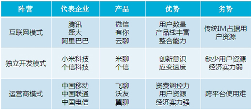 國內(nèi)移動IM領(lǐng)域正式進入群雄爭霸時代,并形成了移動互聯(lián)網(wǎng)新興企業(yè)、互聯(lián)網(wǎng)巨頭、運營商三大陣營。