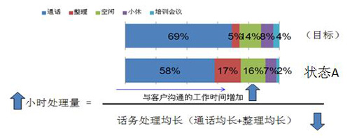 通話狀態(tài)是CSR的重要生產(chǎn)時(shí)間。筆者同過(guò)很多CSR交談,發(fā)現(xiàn)他們都有此看法,通話均長(zhǎng)適當(dāng)增長(zhǎng)通話狀態(tài)就會(huì)提高。但我認(rèn)為這是一個(gè)吃力不討好的方法,影響了個(gè)人的效能與績(jī)效收入。對(duì)于CSR個(gè)體,更重要的是提升自己的應(yīng)答能力,適當(dāng)降低自我的通話均長(zhǎng)與整理均長(zhǎng)。只要做好小休狀態(tài)(CSR主要責(zé)任)、空閑狀態(tài)(排班師、現(xiàn)場(chǎng)主管主要責(zé)任)、整理狀態(tài)(CSR、小組主要責(zé)任),通話狀態(tài)就會(huì)自然增加。