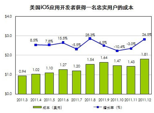 國際著名APP市場營銷組織Fiksu最新的研究數(shù)據(jù)或許能出答案。2011年12月iOS應(yīng)用開發(fā)者獲得一名忠實用戶的成本達到1.81美元,創(chuàng)下歷史新高。而在2011年第一季度,獲得一名用戶的平均成本為0.94美元,一年間單個用戶成本翻了一倍。當(dāng)用戶對蘋果商店里花樣繁多的游戲開始麻木,就需要借助有針對性的推廣策略和強大的執(zhí)行,讓產(chǎn)品脫穎而出。如今忠實用戶成本的提高,使得幾乎所有開發(fā)者乃至小團隊都畏懼前期的市場推廣,大中型開發(fā)公司可利用自身的資源循環(huán)造血拉動用戶,越是小的開發(fā)團隊成功的幾率就越渺茫,而被吞并的可能性則大增。