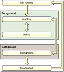 為了節(jié)約電池的電量,智能手機(jī)上的操作系統(tǒng)的一個基本策略是,盡量減少正在運(yùn)行的程序,這個道理很簡單,運(yùn)行的程序越多,需要耗費(fèi)的 CPU 計(jì)算時(shí)間就越多,電量就省不下來。下面的圖是蘋果 iOS 設(shè)備應(yīng)用程序調(diào)度狀態(tài)圖,事實(shí)上蘋果設(shè)備是除了用戶正在操作的程序,其他打開的程序進(jìn)程盡可能都放到“掛起(Suspended)”的狀態(tài)下。在“掛起”的狀態(tài)下面,程序進(jìn)程處在休眠狀態(tài),不耗費(fèi) CPU 計(jì)算能力。當(dāng)用戶沒有對設(shè)備進(jìn)行操作的時(shí)候,整個系統(tǒng)處在休眠的低電狀態(tài)。(這里進(jìn)程的意思是:程序運(yùn)行實(shí)例)