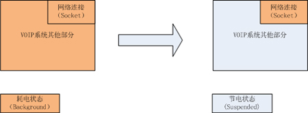 2、程序配置用于 VOIP 業(yè)務(wù)的網(wǎng)絡(luò)連接(Socket),告知系統(tǒng),在程序進(jìn)程被調(diào)度到“掛起(Suspended)”狀態(tài)時(shí)該特殊的網(wǎng)絡(luò)連接需要被系統(tǒng)接管,因此,此時(shí)網(wǎng)絡(luò)連接仍然是活動的。當(dāng)網(wǎng)絡(luò)連接有新的數(shù)據(jù)到達(dá)的時(shí)候,程序?qū)摹皰炱穑⊿uspended)” 狀態(tài)被喚醒到“后臺 (Background)”狀態(tài),如果是個來電事件,VOIP應(yīng)用則發(fā)起一個本地提醒事件,此時(shí)用戶可以在設(shè)備的界面上看到來電提醒,如果用戶選擇接聽來電,則 VOIP 應(yīng)用被調(diào)度到前端的“活動 (Active)”狀態(tài)直接與用戶交互,否則,回退到低電的“掛起(Suspended)”狀態(tài)。下圖可以看到左圖是傳統(tǒng)的 VOIP 應(yīng)用,在“待機(jī)”狀態(tài)下整個程序都運(yùn)行在耗電的“后臺 (Background)”狀態(tài),右圖是蘋果的 VOIP 實(shí)現(xiàn),僅僅網(wǎng)絡(luò)連接運(yùn)行在耗電的“后臺 (Background)”狀態(tài)。其余系統(tǒng)部分運(yùn)行在低電的“掛起(Suspended)”狀態(tài)。