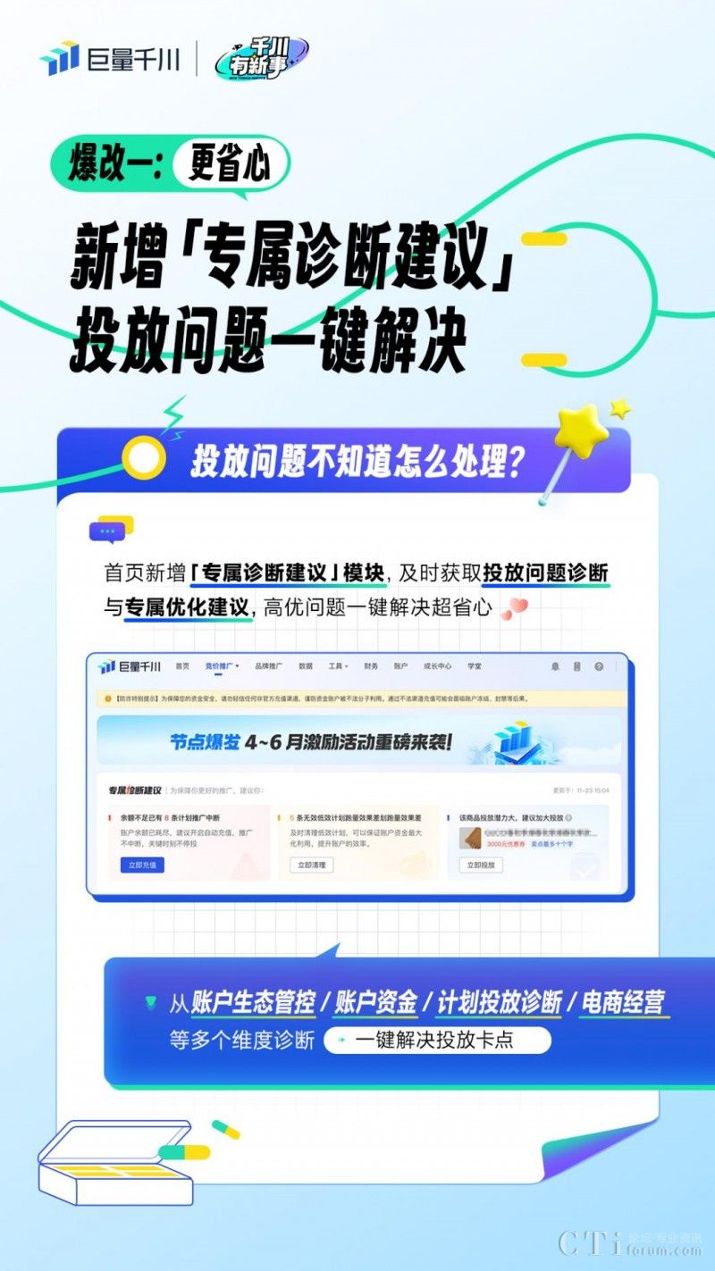 近期,為直面商家投放困境,全面提升投放效率,巨量千川PC端首頁全新推出四大重磅升級——上線「專屬診斷建議」、「數(shù)據(jù)看板」、「重磅產(chǎn)品推薦」和「平臺動態(tài)」,助力商家更便捷、更從容地提升投放質(zhì)量和效果,高效推動生意增長!