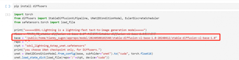 第三步,商城首頁中選擇 SDXL-Lighting 系列模型商品,免費購買后點擊“一鍵試用”。進入notebook頁面后選擇“Python3.9”內核,將第二步復制路徑粘貼到代碼的 base 變量中,點擊保存。