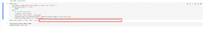 第四步,點擊shift+enter運行,運行完后在紅框處填寫想生成的圖片文字描述,再點擊 shift+enter 運行,就會出現針對描述所生成的圖片。