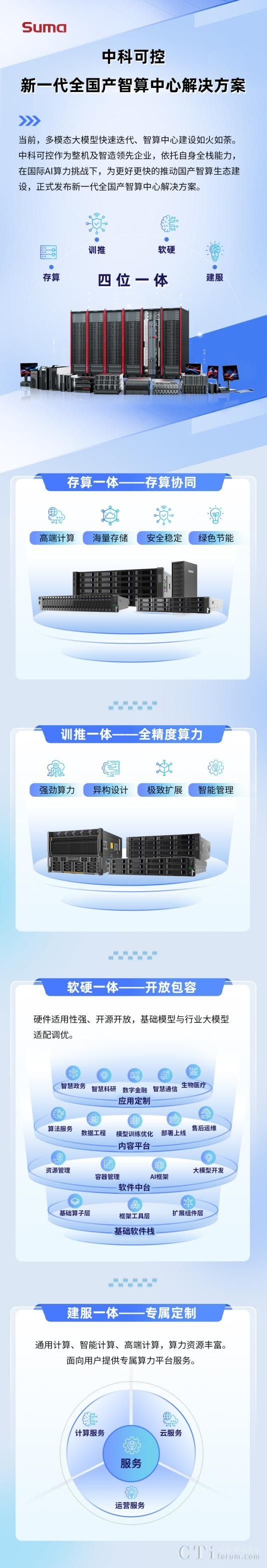 作為整機(jī)及智造領(lǐng)先企業(yè),中科可控一直堅(jiān)持國(guó)產(chǎn)自主路線,結(jié)合當(dāng)下行業(yè)對(duì)于AI技術(shù)的需求,在原有通用解決方案的基礎(chǔ)上,全面推出新一代全國(guó)產(chǎn)智算中心解決方案。該方案通過(guò)“存算+訓(xùn)推+軟硬+建服”四位一體的理念,推動(dòng)國(guó)產(chǎn)智算生態(tài)建設(shè),賦能千行百業(yè)數(shù)智化轉(zhuǎn)型。