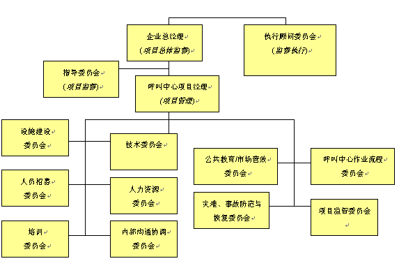 。。對于呼叫中心建設項目實施的規(guī)劃是一個需要付出巨大心血與努力的階段,這個階段需要企業(yè)或組織機構所有人員的廣泛參與和專家意見。對于呼叫中心運營的規(guī)劃,相對與呼叫中心建設項目而言則顯得有些"特殊",它意味著整個呼叫中心建設項目團隊不可能有全部的時間花費在運營規(guī)劃議題上。因此,我們可以將全部項目規(guī)劃工作與任務拆分成若干個規(guī)劃細項,這將保證有較強的可操作性。我們建議采取的方式是將整個項目實施規(guī)劃團隊拆分成負責各個專項實施的小組委員會或附屬委員會。這些小組委員會將集中關注各自特定的項目實施上,當有需要時,與其他各小組進行交流與溝通,并在相關問題上達成一致。按照以上項目組織管理架構其目的是,在項目實施的關鍵環(huán)節(jié)和領域,能產(chǎn)生出更具深度的規(guī)劃方案。這樣操作同時可以使更多的人員參與進來,并有利于增強各個小組的責任感,有助于項目的成功實施。以下的項目指導委員會組織架構不是任何呼叫中心建設項目都能適用的,但是它在某種程度上已經(jīng)為呼叫中心項目規(guī)劃提出了一個基本方針,按照這個思路它將保證項目的成功實施。而對于規(guī)模較小的呼叫中心項目,以上的組織架構成員將扮演多重角色,并負責多項任務項目的實施。就呼叫中心項目規(guī)劃與實施團隊而言,應由若干個負責不同領域實施的小組來組成,以便確保呼叫中心建設項目的所有領域,及各個階段的有效實施。呼叫中心項目規(guī)劃與實施組織架構請見下圖。