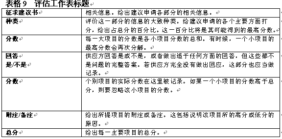 。。在決定了初步要求之后,評估小組應(yīng)具體地開展評估工作。具體評估的目標(biāo)是通過給建議書主要方面打分作出評估。可以在算出建議書各方面占總分?jǐn)?shù)的百分比,如表8中對各方面的總覽。一般在建議書內(nèi)向提供者給出這一信息。