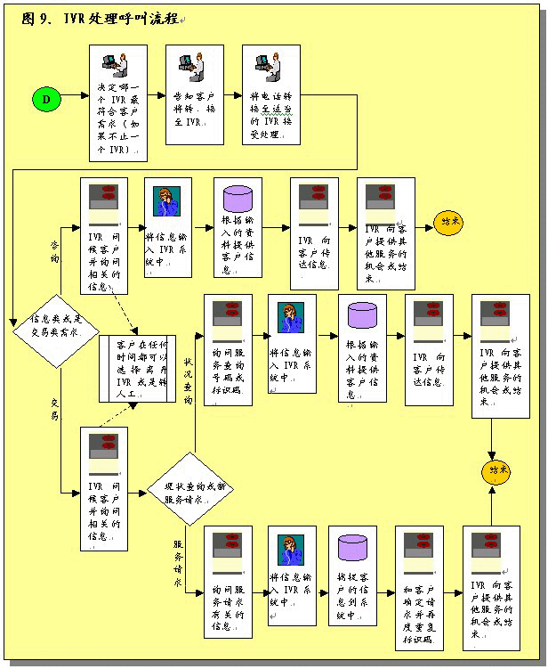 根據(jù)呼叫處理部分所作的說明,在完成初次聯(lián)絡(luò)過程之后,服務(wù)代表將確定呼叫者的需要。之后服務(wù)代表將協(xié)助呼叫者或者使其選擇IVR系統(tǒng),該系統(tǒng)通過自動為這些請求錄音提供相關(guān)的信息和服務(wù)。服務(wù)代表將接受培訓(xùn)識別哪些交易服務(wù)和信息服務(wù)可以通過IVR進(jìn)行,這樣他們可以使呼叫者選擇自我服務(wù)。圖9圖示了用這一辦法處理呼叫的過程。