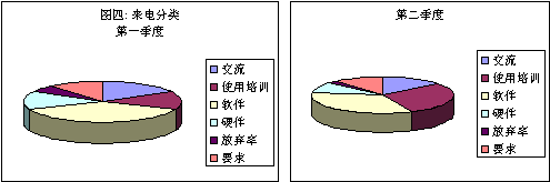 為什么單位設(shè)備來電會增加呢?如果把來電的原因(圖四)分為以下幾類:軟件、硬件、溝通、使用訓(xùn)練、要求、放棄,我們可能會注意到在其他項(xiàng)略有減少的同時,使用訓(xùn)練從開始時的15%躍到第二季度的30%。當(dāng)然,和其他部門合作,這一問題是可以采取各種方式加以解決的。