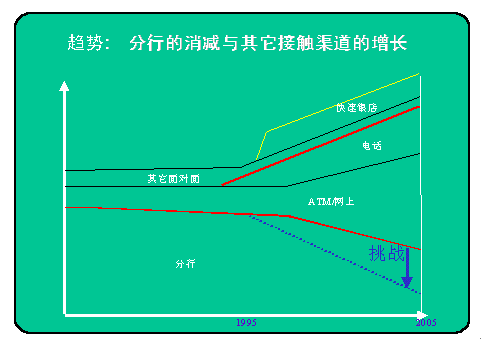 。。下圖為國外專家對(duì)銀行不同客戶服務(wù)渠道發(fā)展比例的說明?梢钥吹,營業(yè)廳的比例在逐年下降,而國外不少銀行甚至將進(jìn)一步壓縮營業(yè)廳比例作為一項(xiàng)渠道的任務(wù)。電話銀行也就是通過IVR實(shí)現(xiàn)的自助服務(wù),自然是呼叫中心的一部分,但人工服務(wù),包括對(duì)上網(wǎng)及其它互動(dòng)方式的客戶提供的座席代表服務(wù),當(dāng)然更是現(xiàn)代呼叫中心業(yè)務(wù)的一部分,圖上雙紅線內(nèi)所表示的正是不斷發(fā)展的呼叫中心的所占比例。