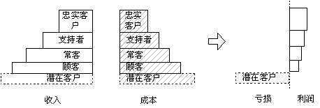 科特勒根據(jù)客戶的忠誠度給了我們一個階梯,這是客戶關系管理工作的良好參照,同時也可作為客戶關系管理工作考核的工具。我們將這個階梯做如下改造:每個層次的寬度是此級次客戶的數(shù)量,每個層次的高度是此級次客戶給企業(yè)帶來的收入,我們可以得到一個企業(yè)收入客戶分布結構圖,如右圖所示: 從圖中可以很清楚的看出客戶管理工作的內(nèi)容:層次寬度(每個層次客戶的數(shù)量)和層次的高度(每個層次客戶的平均贏利水平)。 |