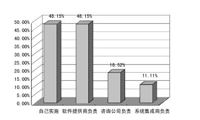 在用戶如何實(shí)施CRM系統(tǒng)的調(diào)查中,已應(yīng)用CRM的單位一般都是由自己或軟件提供商負(fù)責(zé),而沒用CRM的企業(yè)則大多期望能由軟件提供商負(fù)責(zé)。這說明,用戶實(shí)施CRM的主體意識(shí)還不夠強(qiáng)。