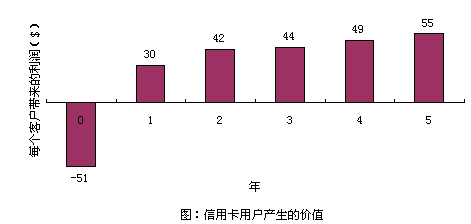 以信用卡服務(wù)為例,爭取一個新的用戶平均要51美圓,用于廣告、推銷和開戶等開支。用戶開始時花錢很少,但為公司帶來一定的利潤。但如果用戶繼續(xù)使用到第二年,就會為公司帶來更多的經(jīng)濟(jì)效益,因?yàn)楣九c客戶之間的信任和客戶對公司的滿意,致使客戶更多地通過信用卡消費(fèi)。(圖:"信用卡用戶產(chǎn)生的價值")用戶貢獻(xiàn)在增加,公司的運(yùn)作費(fèi)用卻在不斷減低。信用卡公司可以不斷減少對客戶信用的審核時間。保持長期的客戶關(guān)系,還可以減少廣告支出,客戶本身就是一個免費(fèi)的廣告資源。很多人在消費(fèi)前喜歡聽取朋友的意見,覺得比廣告更可信。