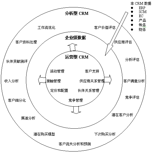 分析型CRM的360度視圖在優(yōu)化有意義的互動(dòng)和個(gè)性化接觸的基礎(chǔ)上,重視公司通過(guò)所有渠道與客戶的交流;而不管這種優(yōu)化是通過(guò)一個(gè)新的營(yíng)銷競(jìng)爭(zhēng)或分析一個(gè)呼叫者的抱怨歷史實(shí)現(xiàn)。這為公司提供了更細(xì)的客戶細(xì)分能力和部署真正的“一對(duì)一”的客戶交流的能力。具有“運(yùn)營(yíng)型” CRM與“分析型”CRM能力的公司,正將它們的企業(yè)戰(zhàn)略轉(zhuǎn)向: