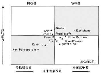 Siebel 和Oracle因為在其CRM中整合了E-Marketing以及公司強大的資金實力,因此在挑戰(zhàn)者中最為引人注目。預(yù)計Siebel 將在6到12個月內(nèi)進入E-Marketing市場的領(lǐng)導(dǎo)者行列。SAP首次出現(xiàn)在這一群體之中,但是它的強項在于其產(chǎn)品易于與已安裝的其它軟件相集成,而不是其E-Marketing的功能,這一點限制了那些沒有購買過SAP產(chǎn)品的企業(yè)接受其產(chǎn)品。
