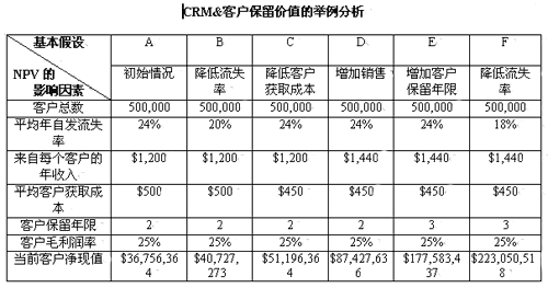 下表列出決定基本NPV的六個基本假設。其他方法也可計算出NPV,但這是CRM中最易使用的方法。使用該方法,不懂財務的經理也能很容易看出CRM的影響,并能夠做出改變客戶營銷投入的決策。