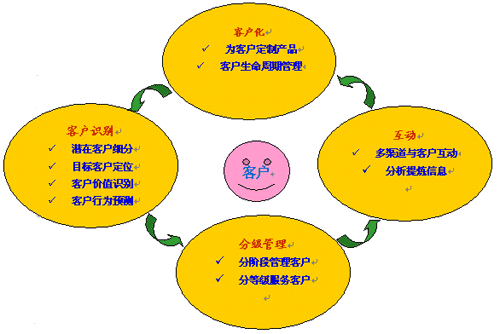 流程涉及到客戶生命周期管理、知識(shí)管理的流程。具體來說,流程涉及到兩大方面,其一,CRM成功實(shí)施后的企業(yè),應(yīng)該在業(yè)務(wù)流程上一個(gè)變革。企業(yè)各個(gè)部門開展業(yè)務(wù)的共同前提是:以客戶為中心。其二,企業(yè)應(yīng)當(dāng)通過CRM來建立一種客戶管理的優(yōu)化流程,從客戶識(shí)別,到分級(jí)管理,再到企業(yè)與客戶互動(dòng),再到為客戶定制產(chǎn)品;然后循環(huán)往復(fù)。具體我們可以參見下圖: