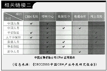 據(jù)某IT媒體2002年末的調(diào)研,只有不到1/5的中國保險公司擁有客戶關(guān)系管理系統(tǒng),但是近六成的保險公司計劃在近期內(nèi)實施CRM;另一份調(diào)查則顯示中國保險業(yè)過去3年的IT投入平均達到9.36億元,幾乎所有的保險公司都在從不同側(cè)面開展CRM建設(shè)。CRM在中國保險業(yè)的應用,到底是處于落伍還是冒進狀態(tài),成為一個意味深長的話題。