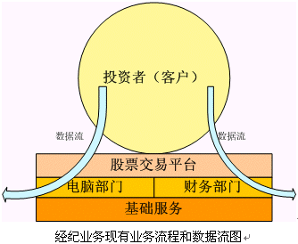 。。從上圖可以看出,現(xiàn)在的證券公司的經(jīng)紀(jì)業(yè)務(wù)為各個(gè)股民或者說(shuō)投資者所提供的服務(wù)就是交易平臺(tái)的服務(wù),也就是交易通道服務(wù)。營(yíng)業(yè)部的其他服務(wù)都是為這個(gè)交易通道服務(wù),這些服務(wù)品種都是非常基礎(chǔ)的。而營(yíng)業(yè)部的數(shù)據(jù)流,也就是各個(gè)客戶的基本信息和交易信息,通過(guò)電腦部和財(cái)務(wù)部門(mén)就走到了終結(jié),沒(méi)有被更好的利用。