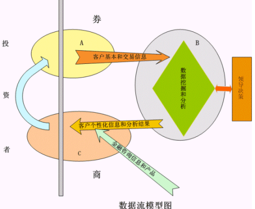 。。在整個(gè)的數(shù)據(jù)流循環(huán)模型中,可以分為三個(gè)模塊:A模塊,客戶通過交易通道進(jìn)行投資活動;B模塊,根據(jù)客戶的基本信息和交易信息,進(jìn)行大量的數(shù)據(jù)挖掘和數(shù)據(jù)分析,為領(lǐng)導(dǎo)決策進(jìn)行支持,并且得到客戶的個(gè)性化信息和各種分析結(jié)果;C模塊,根據(jù)各種數(shù)據(jù)的分析結(jié)果,同時(shí)根據(jù)投資咨詢師手中現(xiàn)有的信息產(chǎn)品,為客戶提供真正的個(gè)性化的咨詢服務(wù),并且把此個(gè)性化的咨詢服務(wù)即時(shí)傳遞給投資者,為客戶進(jìn)行下一次的投資活動而準(zhǔn)備。