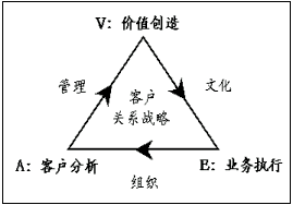 在全球CRM最佳實(shí)踐中有一種被稱作CRM"魔三角"的原理,備受企業(yè)的青睞。如下圖所示,構(gòu)成三角形三個(gè)頂點(diǎn)的,分別是"A"客戶分析、"V"價(jià)值創(chuàng)造和"E"業(yè)務(wù)執(zhí)行,它們反映客戶關(guān)系管理的全部內(nèi)容;構(gòu)成三角形三條邊的分別是"AV"管理、"VE"文化和"EA"組織,它們代表與客戶關(guān)系管理內(nèi)容相適應(yīng)的運(yùn)營環(huán)境及其方法。