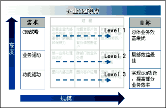 從全球CRM最佳實踐來看,企業(yè)實施CRM不外乎CRM軟件功能驅(qū)動、業(yè)務(wù)驅(qū)動和客戶關(guān)系戰(zhàn)略驅(qū)動三種情況。所以,實施CRM的視點也有三種,如下圖所示:一是,從CRM產(chǎn)品功能角度,根據(jù)產(chǎn)品所能提供的功能,選擇自己需要實施的CRM內(nèi)容。這種視點充其量只能夠讓企業(yè)擁有部分CRM的功能,有限地提高部分業(yè)務(wù)處理的效率。二是,從業(yè)務(wù)角度出發(fā),通過局部優(yōu)化業(yè)務(wù)流程,實施CRM。在項目中所涉及的業(yè)務(wù)流程可能要貫穿多個CRM功能模塊。這種視點解決了一部分業(yè)務(wù)問題,它主要以流程效益或部門效益最優(yōu)為目標(biāo)。三是,從企業(yè)CRM戰(zhàn)略角度出發(fā),從總體、全局、發(fā)展的高度規(guī)劃和實施CRM。CRM戰(zhàn)略驅(qū)動視點不僅追求局部效益最優(yōu),而且能夠?qū)崿F(xiàn)企業(yè)總體業(yè)務(wù)效益的最大化。雖然,企業(yè)可以根據(jù)自身客戶關(guān)系管理的實際情況選擇CRM視點的高度,但是在絕大多數(shù)企業(yè)的實踐中,都會選擇CRM戰(zhàn)略高度作為著眼點,規(guī)劃企業(yè)客戶關(guān)系管理。
