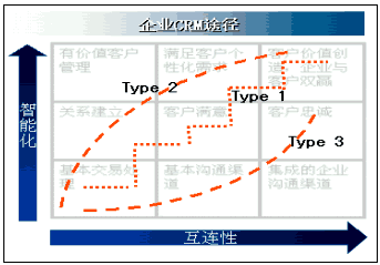 1是"小步快跑"型,Type 2是"改革優(yōu)先"型,Type 3是"技術(shù)驅(qū)動"型,如下圖所示。圖中互連性,表示企業(yè)信息化環(huán)境建設(shè)的規(guī)模,也意味著企業(yè)與客戶的交互程度,即溝通能力;縱坐標(biāo)所示的智能化,代表管理思想、管理模式、知識應(yīng)用和情感投入,是客戶關(guān)系管理中人性化和價值衡量的雙重體現(xiàn)。