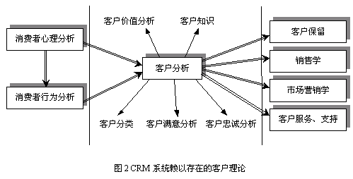 大多數(shù)CRM研究人員和應用專家不認為CRM存在作為應用支撐的理論基礎(chǔ),充其量認為CRM只是支持企業(yè)營銷的商業(yè)策略。隨著企業(yè)追求市場活動績效的熱情的提高,企業(yè)開始采用定性和定量的分析方法決策其與市場和客戶有關(guān)的企業(yè)活動,如有效的客戶滿意度評價、客戶分類、客戶盈利率分析等。而這些決策迫切需要相關(guān)的理論基礎(chǔ)為指導,真正擺脫靠經(jīng)驗進行決策的做法。當前CRM的理論研究和學術(shù)探討并未真正走向體系化、統(tǒng)一化,所以造成CRM市場中提供的功能參差不齊。CRM系統(tǒng)必須存在一個完整的理論體系為指導,本文將CRM系統(tǒng)賴以存在的理論基礎(chǔ)統(tǒng)稱為客戶理論(Theory on Customer)。