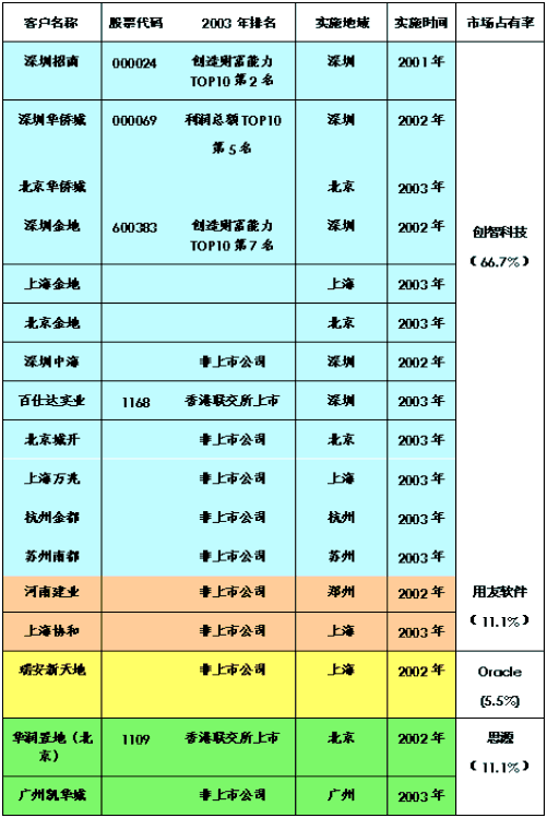 在國務(wù)院發(fā)展研究中心企業(yè)研究所、清華大學(xué)房地產(chǎn)研究所和搜房研究院共同發(fā)起評(píng)比的"中國房地產(chǎn)TOP10"中已經(jīng)有3家企業(yè)導(dǎo)入CRM,它們是:居財(cái)富創(chuàng)造能力TOP10第2位的深圳招商;居利潤總額TOP10第5位的深圳華僑城;居財(cái)富創(chuàng)造能力TOP10第7位的深圳金地。截止2003年10月底,只有創(chuàng)智科技公司為"中國房地產(chǎn)TOP10"提供了房地產(chǎn)CRM解決方案。