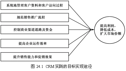 維奧制藥針對自身特定的業(yè)務(wù)需求,結(jié)合CRM的經(jīng)營理念,提出圖24.1所示CRM實踐的目標實現(xiàn)途經(jīng)。