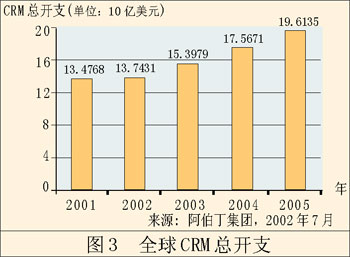 單單這還不是惟一能夠說明問題的。早在2002年,F(xiàn)orrester研究公司就聲稱,來自CRM的收入將從428億美元增長(zhǎng)到738億美元。AMR研究公司同樣預(yù)測(cè),這個(gè)領(lǐng)域會(huì)不斷增長(zhǎng)。AMR的調(diào)查表明,91%的公司會(huì)在這方面增加開支,預(yù)計(jì)總開支會(huì)增長(zhǎng)8%。值得一提的是,AMR所指的這一塊市場(chǎng)是“客戶管理”,而不是較為傳統(tǒng)的CRM,這說明CRM應(yīng)用軟件的作用發(fā)生了轉(zhuǎn)變。