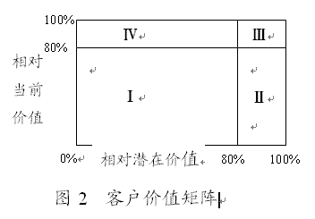 (二)確定客戶當(dāng)前相對價值和客戶相對潛在價值通過預(yù)測,識別出了客戶當(dāng)前價值CCV和增值潛力CPV。但是,這兩個維度指標(biāo),均以絕對價值形式出現(xiàn)對客戶進行細(xì)分并不理想(張國方,金國棟,2003(3)),在一定程度上會影響到理論應(yīng)用的方便性(簡便性)。因此,可以采用更加明了和更具有實踐操作性的維度指標(biāo)——客戶當(dāng)前相對價值和客戶相對潛在價值!翱蛻舻南鄬Ξ(dāng)前價值”是指某一客戶提供的當(dāng)前價值與企業(yè)未來可望實現(xiàn)的當(dāng)前價值總額的比值;而“客戶的相對潛在價值”是某一客戶提供的增值價值與企業(yè)未來可望實現(xiàn)的全部最大增值價值的比值。