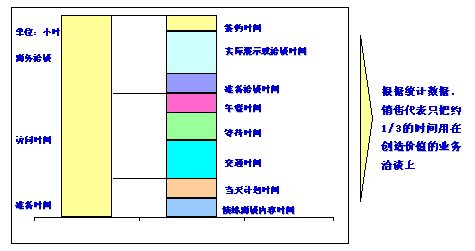 銷售資源是有限的,如何合理分配資源并確保最大的客戶機(jī)會和客戶價值是一個關(guān)鍵的問題。對于銷售代表,個人的時間是寶貴的資源。根據(jù)統(tǒng)計數(shù)據(jù),銷售人員只把約1/3的時間用于增值的業(yè)務(wù)洽談上,這意味著在銷售人員的時間管理上有很大的提升空間。如圖3-1所示。