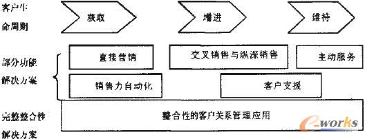Kalakota and Robinson認(rèn)為,客戶關(guān)系管理主要包括了三個不同的階段,分別為獲。ˋcquisition)、增進(Enhancement)與維持(Retention)。而這三個各異的部份,也正和客戶的不同生命周期階段不謀而合。