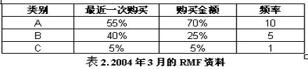 為了進(jìn)一步了解客戶,必須對(duì)客戶最近一次購(gòu)買時(shí)間、頻率和購(gòu)買金額(RFM)進(jìn)行簡(jiǎn)單的分析。從下表中我們發(fā)現(xiàn)頻繁進(jìn)行采購(gòu)的活躍客戶訂單金額占了總收入的大部分。