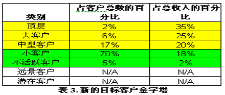 表3顯示客戶在分布上發(fā)生了重大變化,同時(shí)也給出了相應(yīng)的收入分布。目前,銷售總收入的80%來(lái)自活躍客戶(這部分客戶占總客戶數(shù)的60%)。在新的金字塔中,80%左右的銷售收入來(lái)自頂層客戶、大客戶和中型(黃色背影的)客戶。
