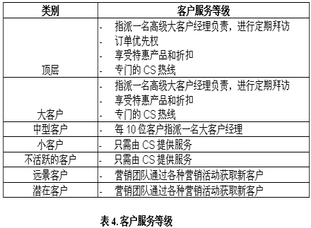 由于客戶各不相同因而相對(duì)重要的客戶就應(yīng)得到比其他客戶更好的服務(wù)。也就是說(shuō)企業(yè)資源的分配必須以此為指導(dǎo)方向。下表概括了各客戶類別中客戶應(yīng)得到的服務(wù)。
