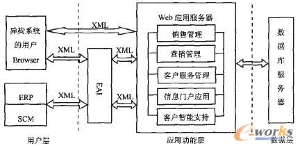 包括ERP、SCM等其他企業(yè)應(yīng)用在內(nèi)的所有的系統(tǒng)用戶與應(yīng)用功能層的數(shù)據(jù)交換均通過XMI數(shù)據(jù)進(jìn)行傳輸,從而大大減小了各種企業(yè)應(yīng)用系統(tǒng)間的通信阻力,為EAI提供了良好的通信平臺。Web用戶的客戶端只是“瘦小的”瀏覽器日_數(shù)量不受限制,不需要安裝專門的軟件,這使得凡可以接入Internet的用戶都可以方便、靈活地使用系統(tǒng),大大提升了系統(tǒng)用戶間溝通、協(xié)作的效率。此外,由于CRM應(yīng)用系統(tǒng)是在中央服務(wù)器上實施和維護(hù)的,對客戶端的要求遠(yuǎn)沒有C/S結(jié)構(gòu)那么高,集中的軟件實施和維護(hù)大大節(jié)約了企業(yè)的運行成本和維護(hù)費用。圖1描述的是筆者所要闡述的適應(yīng)網(wǎng)絡(luò)環(huán)境的基于Web的系統(tǒng)平臺架構(gòu),這并不意味著CRM應(yīng)用系統(tǒng)完全以這種方式運行,事實上用戶接入CRM系統(tǒng)的方式是多種多樣的,系統(tǒng)還應(yīng)該提供電話、傳真、無線接入等多種接入接口。