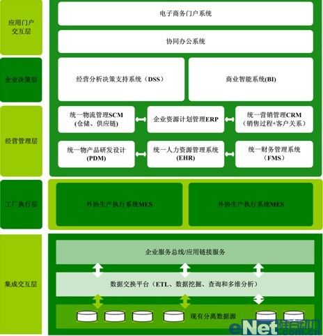根據企業(yè)管理發(fā)展戰(zhàn)略及目標,需要考慮建設“集成化數字管控制造系統”,涵蓋企業(yè)決策層、企業(yè)經營管理層。根據整體業(yè)務模式,企業(yè)經營管理層又可以進一步分解為公司管理層和工廠執(zhí)行層;從信息化戰(zhàn)略支撐角度可以分解為企業(yè)門戶交互層、應用系統層、應用集成層和網絡支撐層。實現企業(yè)信息流、資金流、物流、商物流的高度集成、統一,為企業(yè)生產、經營提供強有力的信息化支撐。