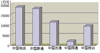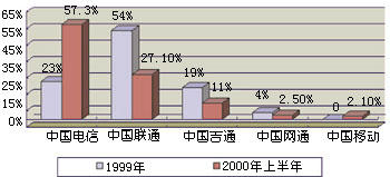 通過(guò)引入IP電話業(yè)務(wù),我國(guó)電信市場(chǎng)已經(jīng)形成了以中國(guó)電信、中國(guó)聯(lián)通、中國(guó)移動(dòng)、中國(guó)吉通和中國(guó)網(wǎng)通等五大電信運(yùn)營(yíng)公司為主體的新格局。他們各自的業(yè)務(wù)范圍不盡相同,但I(xiàn)P電話是他們相同的業(yè)務(wù)之一,所以這一市場(chǎng)相互之間的競(jìng)爭(zhēng)較為激烈。圖1和圖2分別表示這五大運(yùn)營(yíng)商在2000年上半年IP電話的話務(wù)量和收入。從圖中可以看出,他們?cè)谖覈?guó)IP電話市場(chǎng)上所占據(jù)的地位和角色。