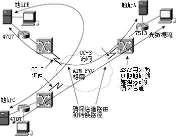 這個(gè)例子中,OC-3 ATM連接配置上3 Mbps PVCsL連到不同的遠(yuǎn)程位置。RSVP確保QOS從這個(gè)PVC通過(guò)當(dāng)?shù)氐木W(wǎng)絡(luò)路由連到正確的使用地。