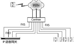 在這種應用方式中, IP語音網關采用FXO接口與PBX(用戶電話交換機)互連,電話直接接入PBX,未接入PBX的外部電話,經電話公網(PSTN)與PBX相連。