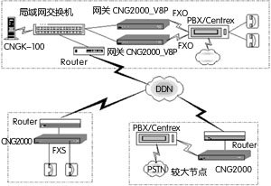 用這種方式組建IP語音系統(tǒng),各節(jié)點可根據接入的用戶數及通信話務量大小,靈活匹配一臺或多臺CNG-2000 IP接入網關。實際撥打時只需撥打配置好的號碼,撥號方式簡單。