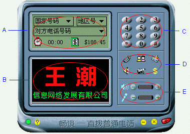 。ㄈ鐖D1)“王潮暢談?wù)Z音全球通”的主界面。A部分是虛擬液晶顯示屏,這里顯示的內(nèi)容與 D(功能鍵區(qū))相對應(yīng),B是廣告位,如果有興趣可以與王潮公司聯(lián)系作廣告(^_^),C是撥號區(qū),D是功能按鈕區(qū),集中了這個(gè)軟件的主要功能,E是音量調(diào)節(jié)區(qū)。整個(gè)界面簡潔合理。