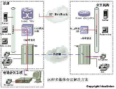 圖中紅色實(shí)線表示通過IP網(wǎng)絡(luò)傳輸語音的線路,藍(lán)色虛線表示通過PSTN傳輸語音的線路。由于通過IP網(wǎng)絡(luò)沒有使用額外的長途線路,所以降低了遠(yuǎn)程會(huì)議系統(tǒng)的運(yùn)行成本。同時(shí)VoIP傳輸系統(tǒng)支持普通的長途電話呼叫,為客戶節(jié)省長途電話開支。