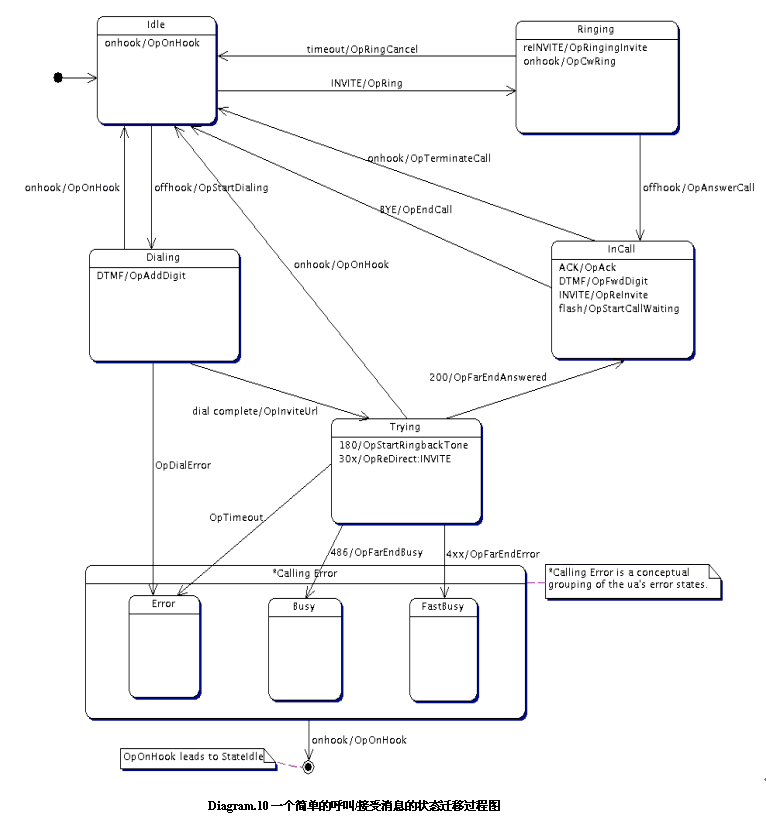 我們根據(jù)SIP協(xié)議來定義一下一個發(fā)起呼叫或者是等待接收一個呼叫的狀態(tài)遷移過程:
