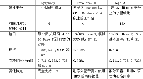 企業(yè)這部分市場(chǎng)與通信公司那部分不同。第一,企業(yè)不需要運(yùn)載公眾呼叫,因此產(chǎn)品的規(guī)模較小。第二,企業(yè)愿意用連接到公司內(nèi)部網(wǎng)絡(luò)的IP電話產(chǎn)品代替?zhèn)鹘y(tǒng)的PBXs,因此這部分產(chǎn)品必須提供基本的PBX功能,比如呼叫保持和呼叫轉(zhuǎn)移。表2是一些相關(guān)的產(chǎn)品。