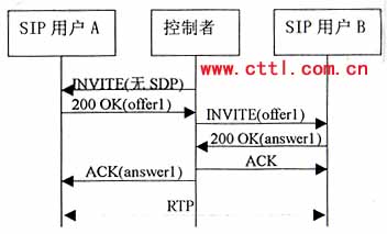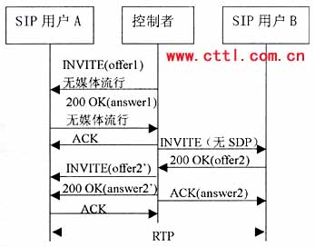 控制者再向B發(fā)送一個(gè)沒有SDP的INVITE。B應(yīng)答的200 0K響應(yīng)中包含一個(gè)提供offer2,控制者應(yīng)該基于offer2向A發(fā)送一個(gè)re-INVITE,注意。offer2可能需要稍作修改來(lái)滿足媒體要求。例如如果offer1包含一個(gè)音頻和一個(gè)視頻行,而offer2只有一個(gè)音頻行,控制者就需要在offer2中增加一個(gè)視頻行(端口設(shè)為O)來(lái)構(gòu)成offer2’。由于這是一個(gè)re-INVITE,所以通常應(yīng)該能立即收到響應(yīng)。A的200