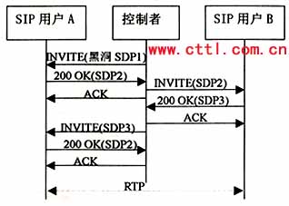 該流程中,控制者首先向用戶A發(fā)送INVITE,包含SDP1,用來(lái)創(chuàng)建一個(gè)初始的“黑洞”媒體流,A振鈴并產(chǎn)生應(yīng)答記為SDP2,其中包含的是一個(gè)有效的連接地址,但此時(shí)仍沒有媒體流向控制者?刂普呦駻發(fā)出ACK。